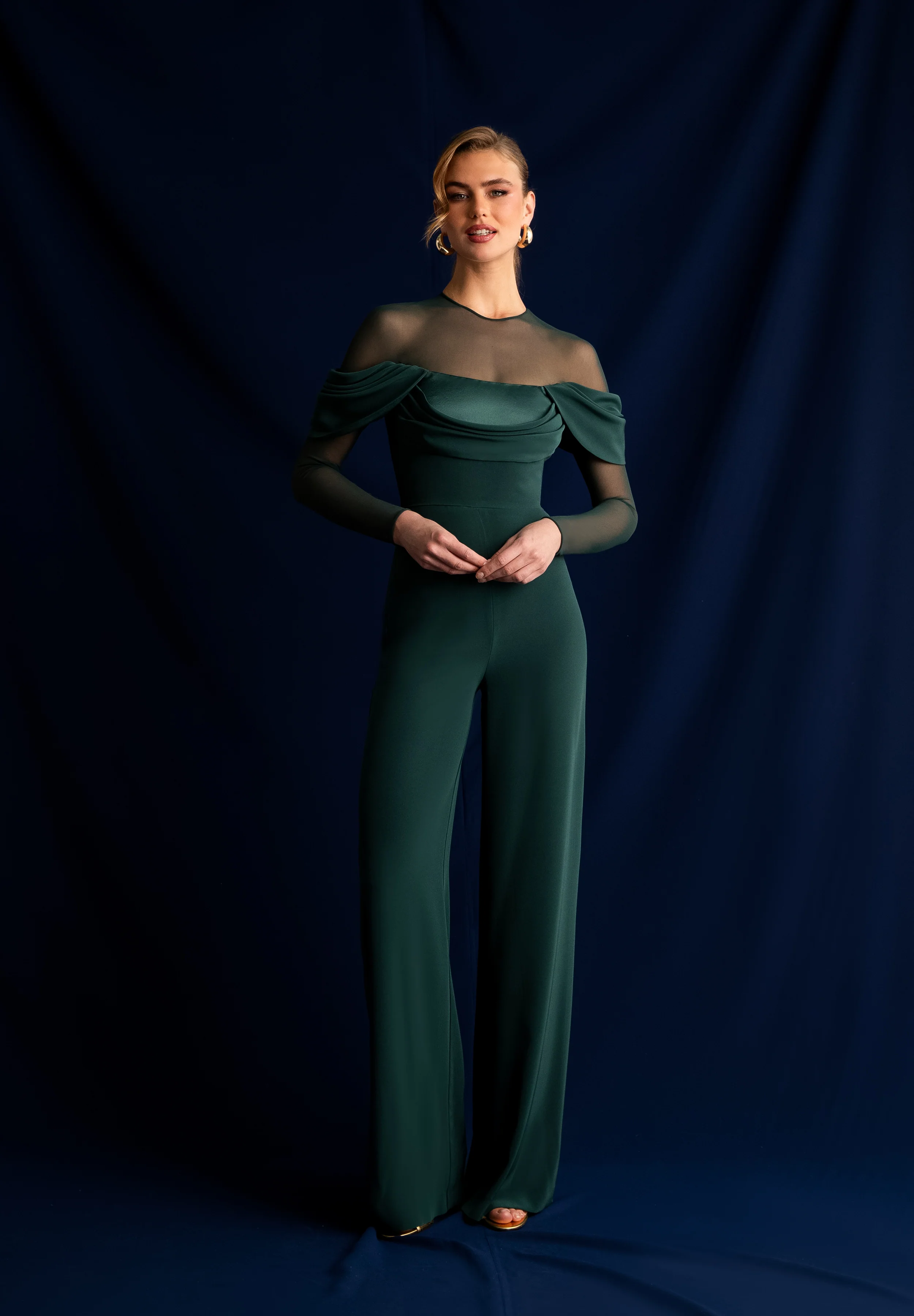 Mono de triacetato con parte superior y mangas en tul al tono. Pieza de brillo en el cuerpo y drapeados que envuelve los brazos y cae sobre el delantero.