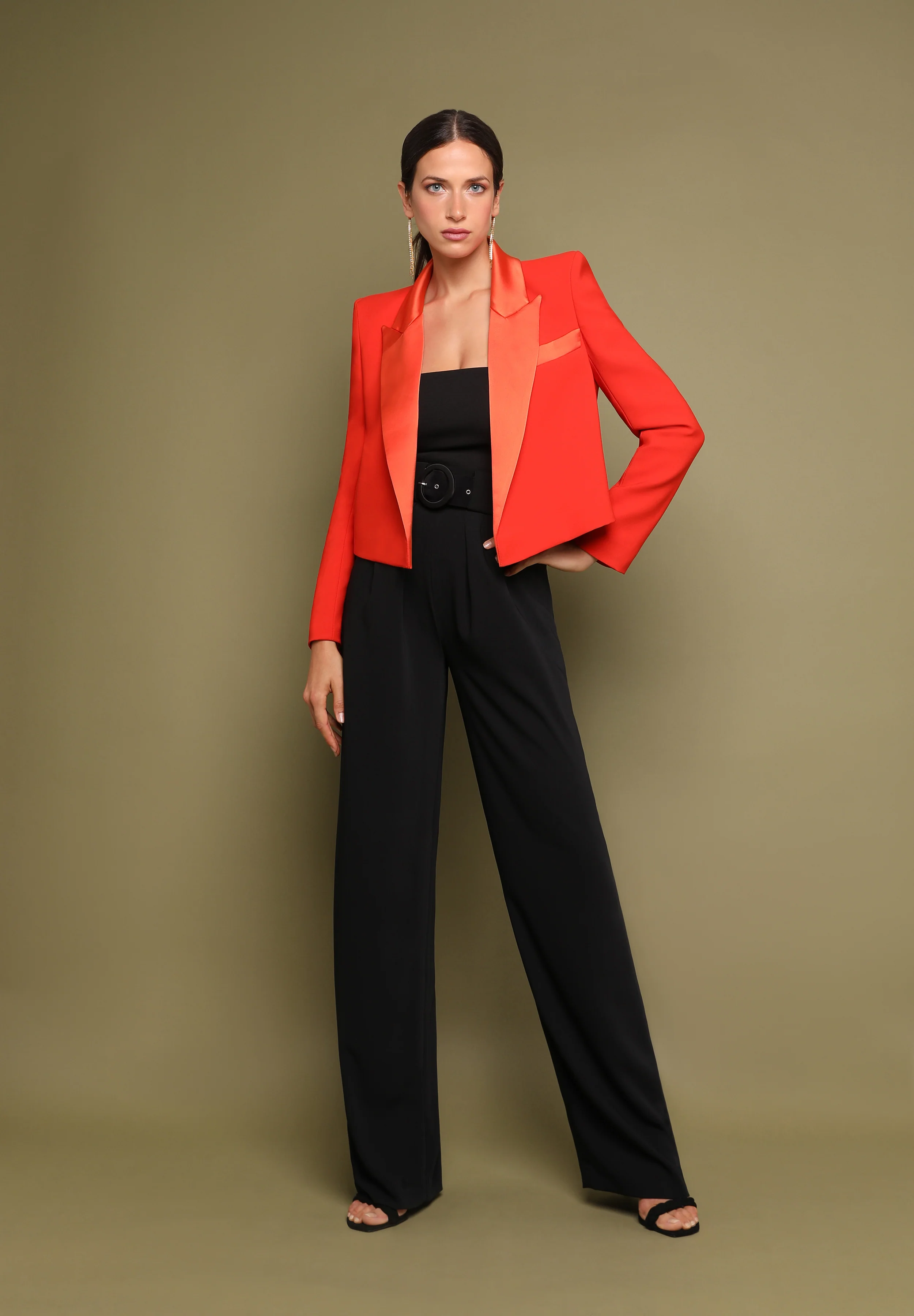 Pantalón largo de crepé con tablón central y cinturilla ancha con trabilla para cinturón.
