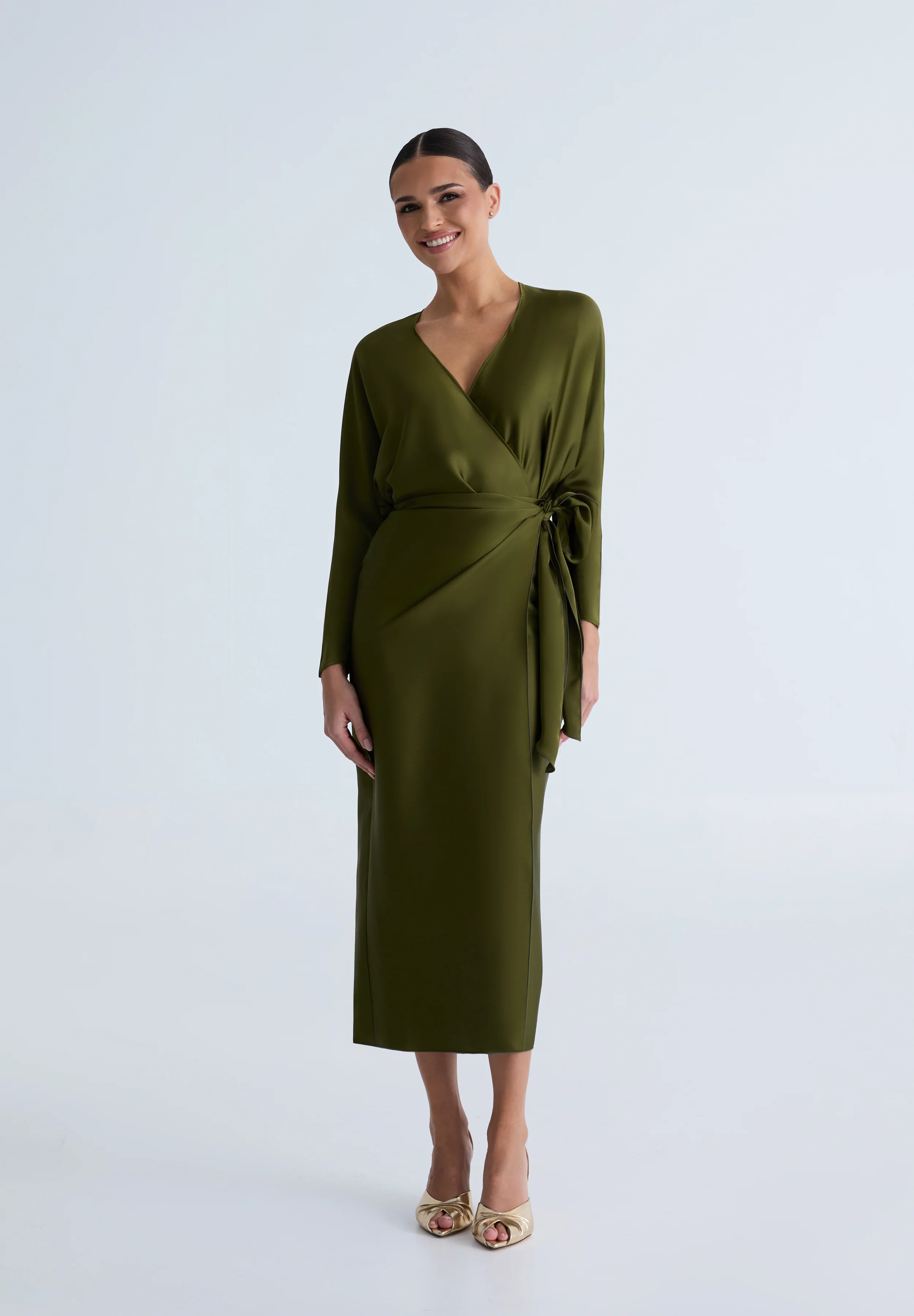 VENTA EXCLUSIVA ONLINE. Vestido realizado en satén con cuerpo cruzado y manga murciélago larga. Corte en la cintura con falda pareo midi.
