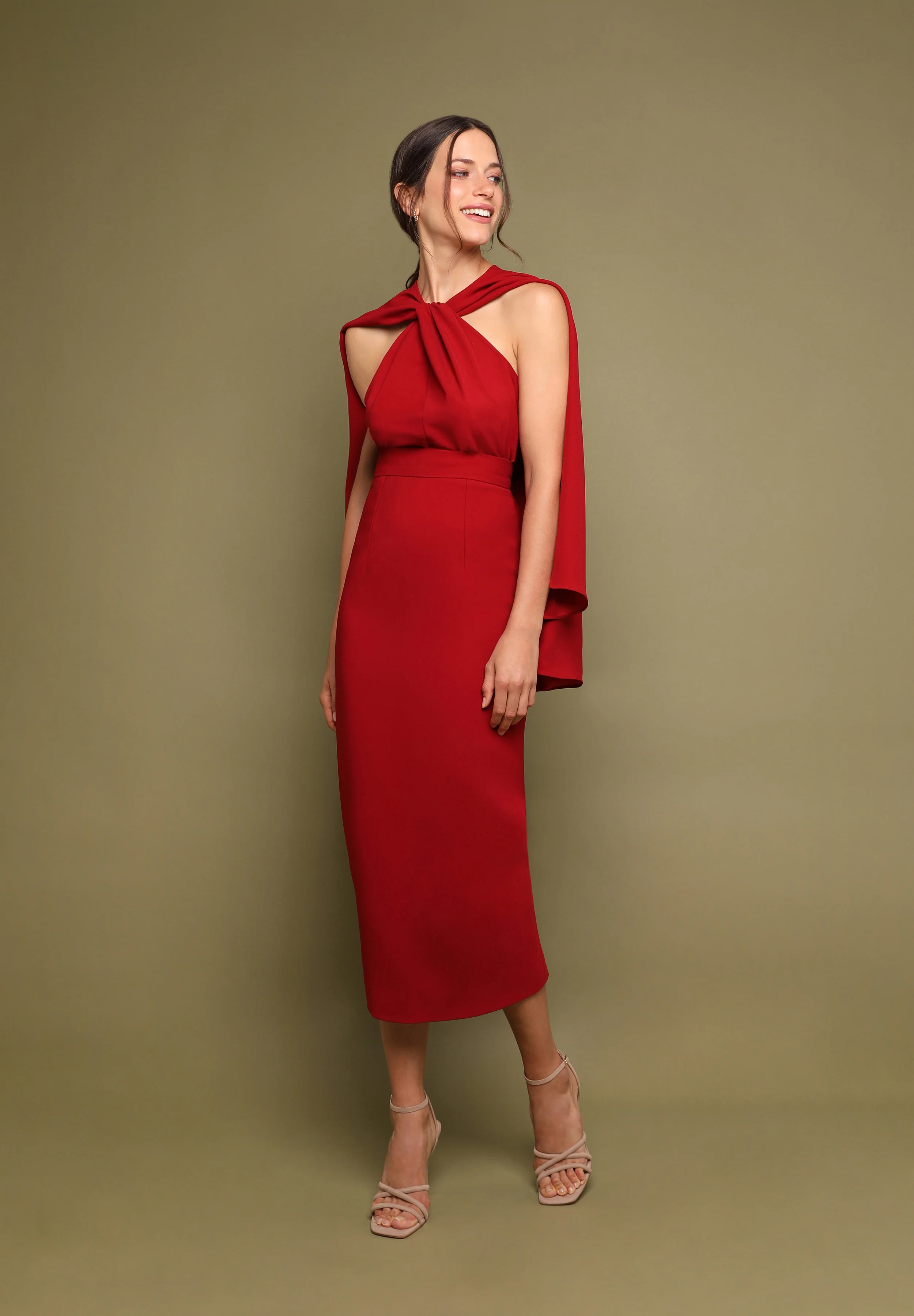 Top de crepé con nudo en el escote del que cae una capa sobre la espalda hasta la altura de la cadera.