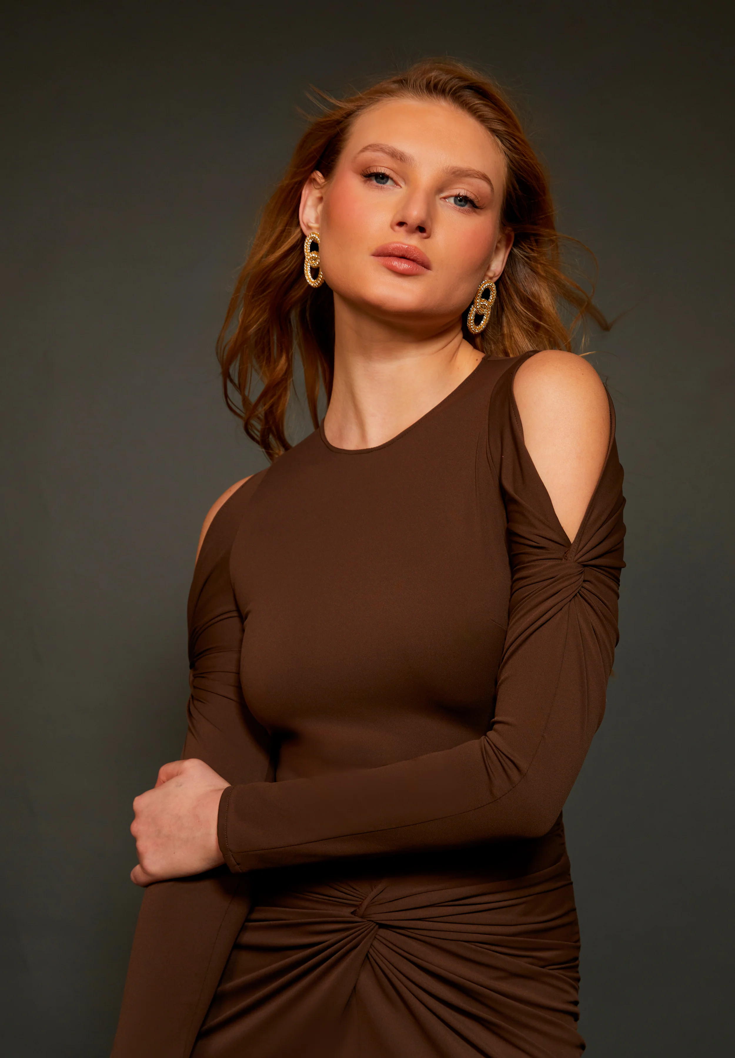 Top de punto con escote a la caja y manga larga. Mangas largas con nudo que dejan al descubierto los hombros.