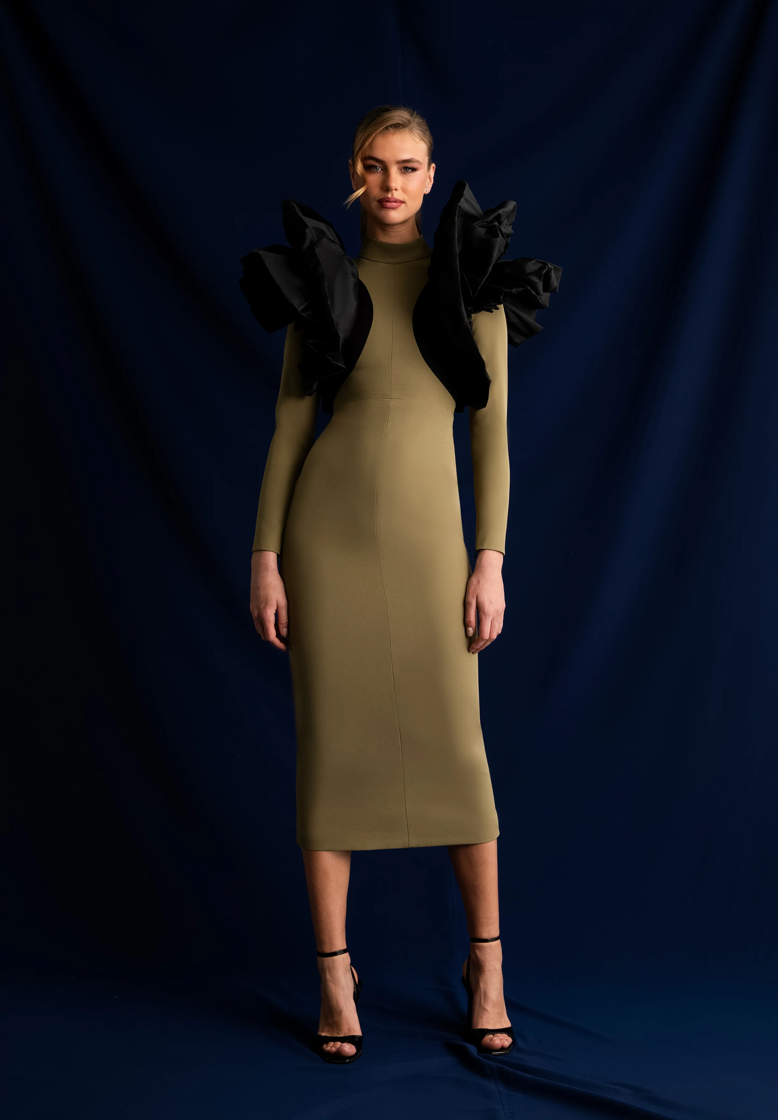 Vestido bicolor en crepé con cuello subido y cortes en el cuerpo que juega con piezas de diferente color. Volantes en tafeta de seda que recorren la sisa y crean un gran volumen sobre los hombros.