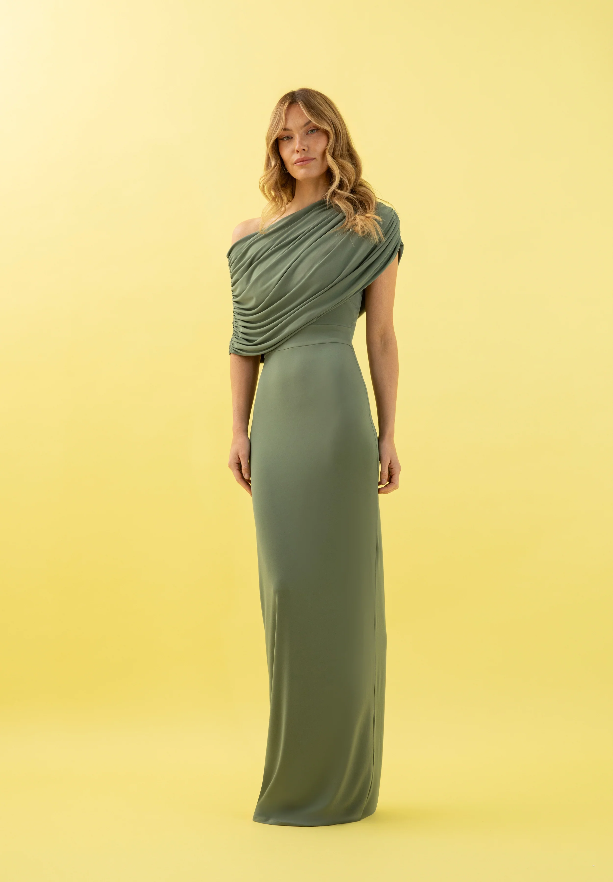 Vestido de punto asimétrico con cuello drapeado que envuelve el cuerpo y deja al descubierto un hombro. Corte en la cintura con falda recta.