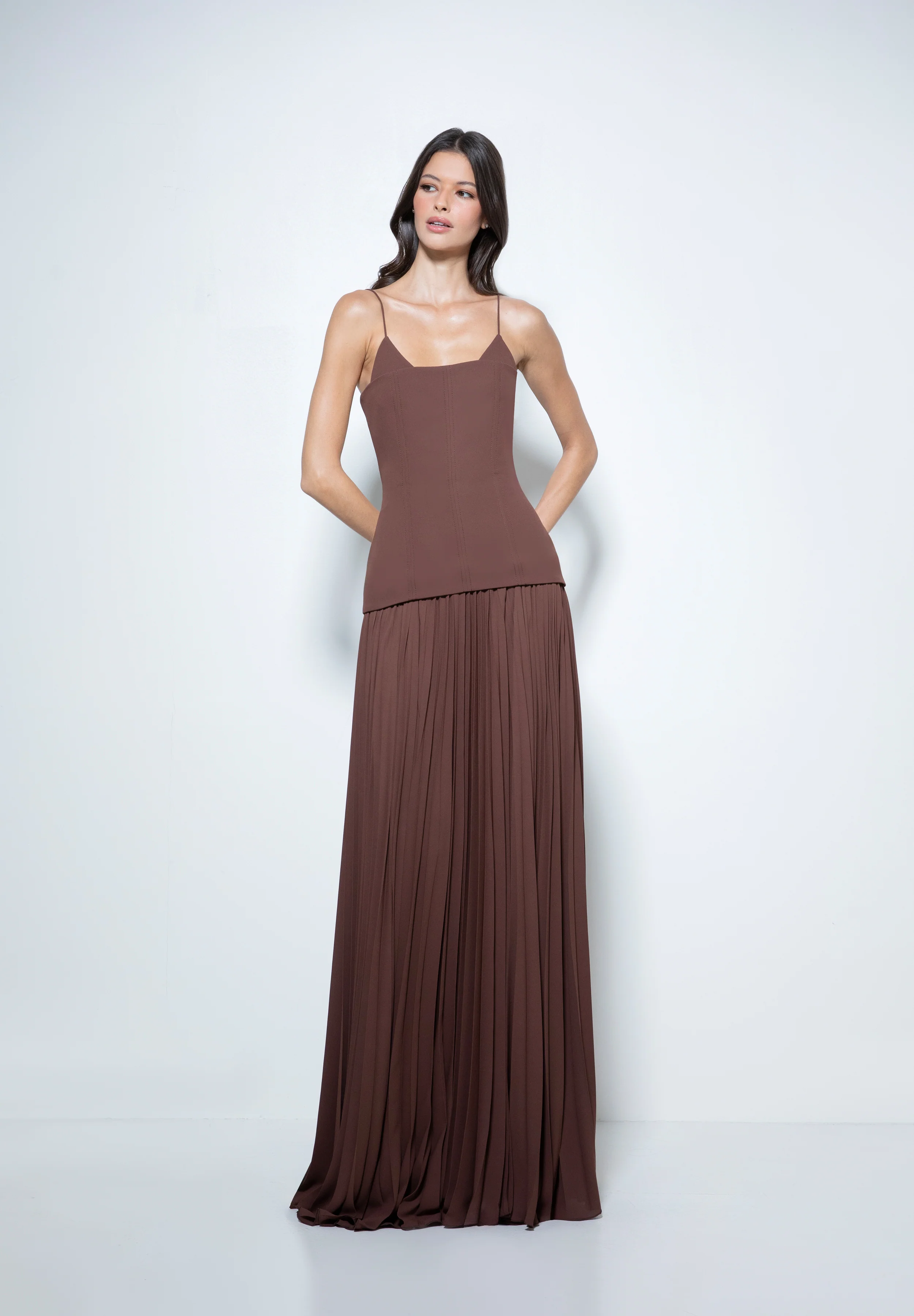 Vestido de crepé con cuerpo corsetero pespunteado que se encuentra unido sobre la falda plisada.