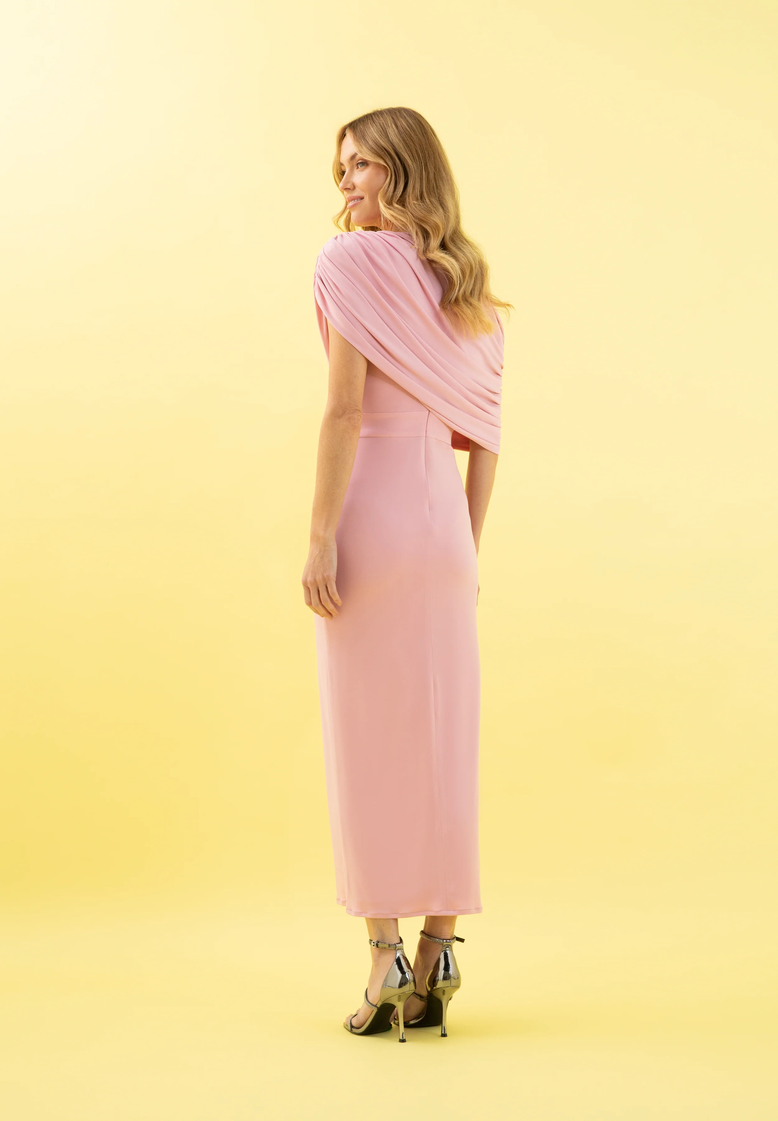 Vestido de punto asimétrico con cuello drapeado que envuelve el cuerpo y deja al descubierto un hombro. Corte en la cintura con falda recta.