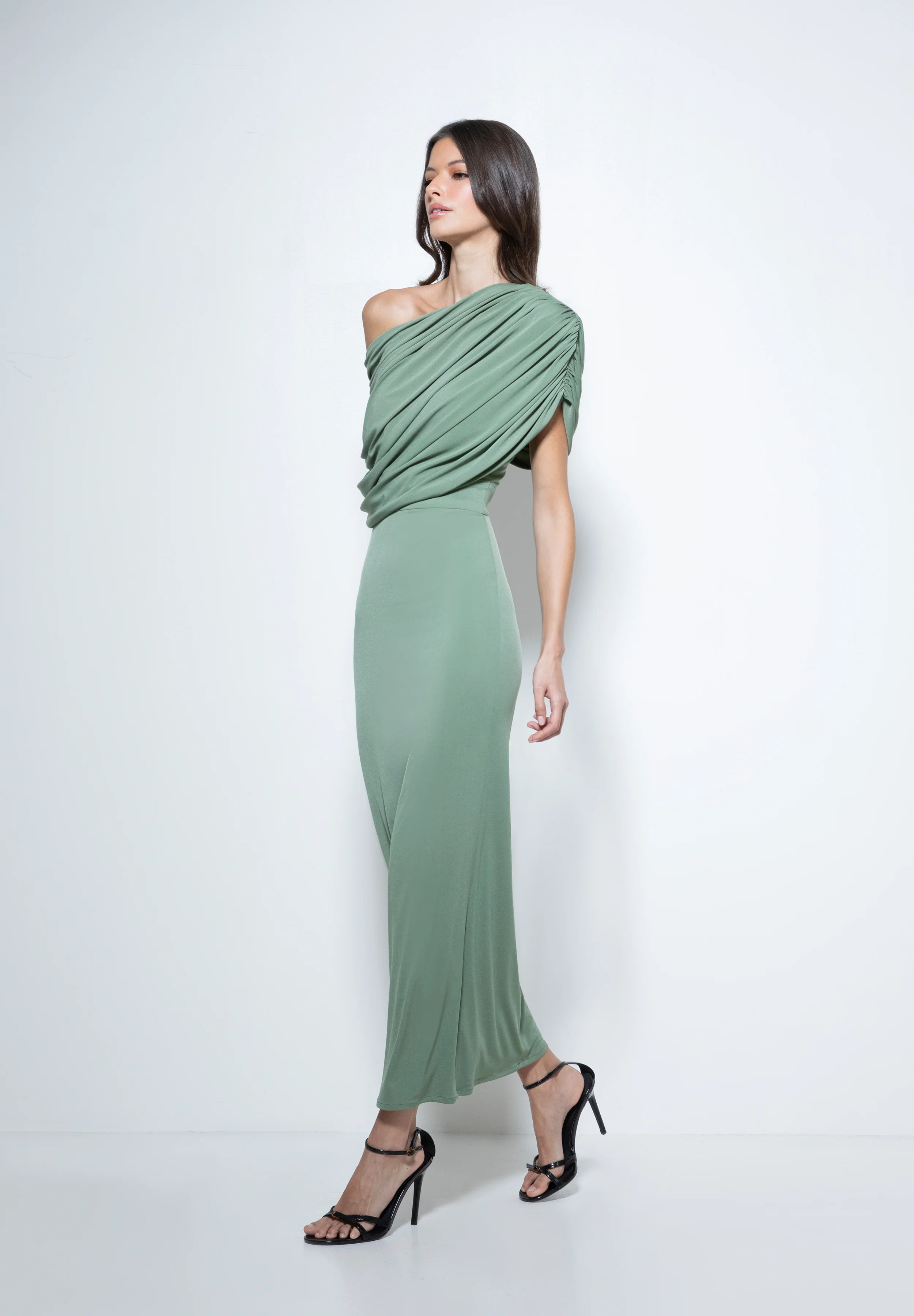 Vestido de punto asimétrico con cuello drapeado que envuelve el cuerpo y deja al descubierto un hombro. Corte en la cintura con falda recta.